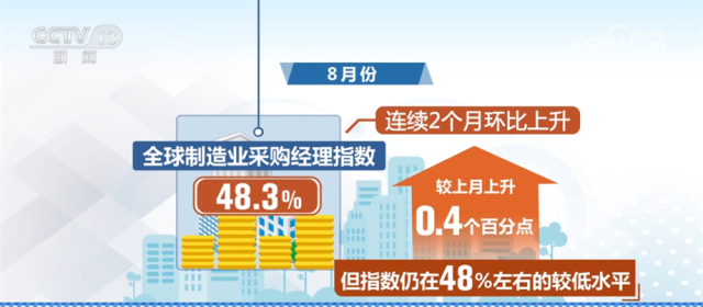 8月份全球制造業(yè)采購經(jīng)理指數(shù)為48.3%,較上月上升0.4個百分點,連續(xù)2個月環(huán)比上升,但指數(shù)仍在48%左右的較低水平,全球經(jīng)濟呈弱勢修復(fù)態(tài)勢,總體趨緊的大環(huán)境沒有改變,需求收縮壓力仍然存在。