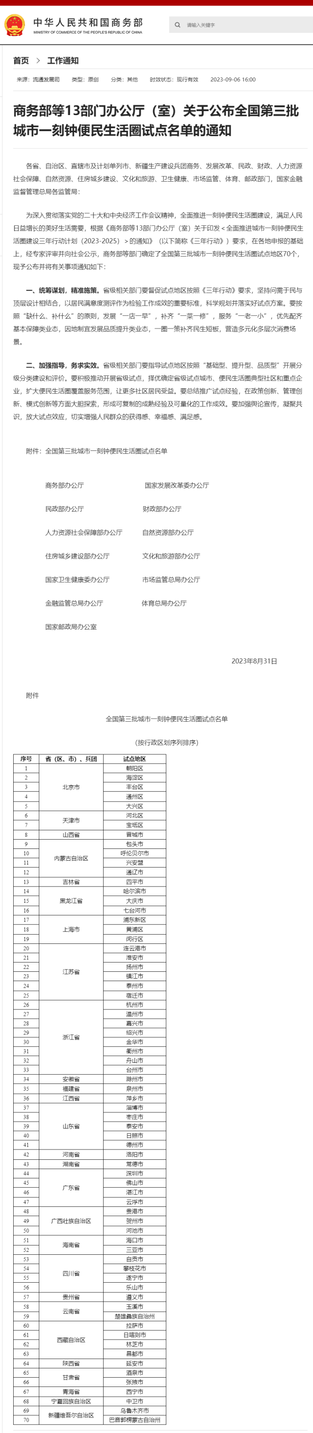 商務(wù)部等13部門(mén):全國(guó)第三批城市一刻鐘便民生活圈試點(diǎn)地區(qū)70個(gè)