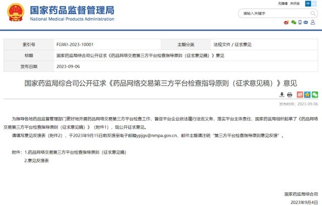 國家藥監(jiān)局就《藥品網(wǎng)絡(luò)交易第三方平臺檢查指導(dǎo)原則(征求意見稿)》公開征求意見
