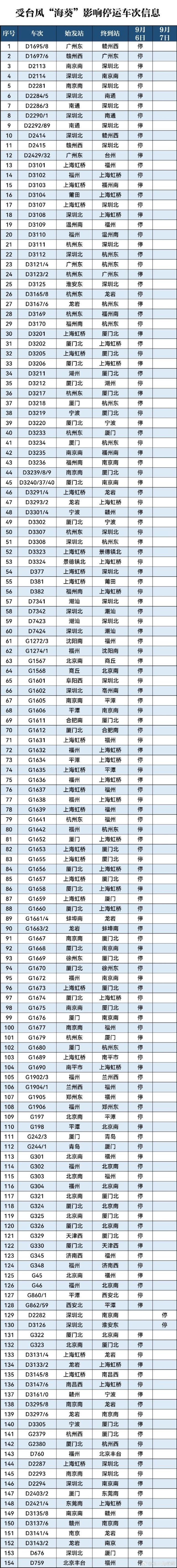 受臺(tái)風(fēng)“海葵”影響部分列車(chē)停運(yùn),車(chē)次信息公布