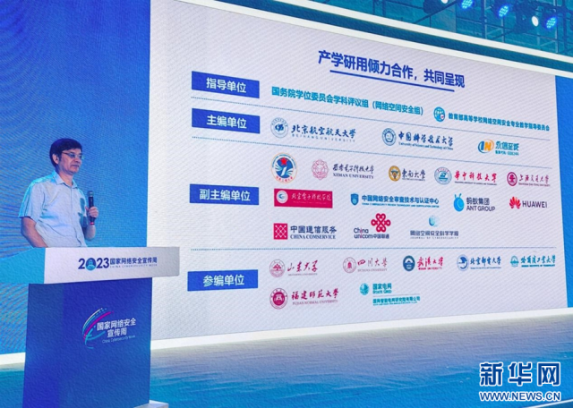 教育部高等學校網(wǎng)絡空間安全專業(yè)教學指導委員會副主任委員、中國科學技術大學網(wǎng)絡安全學院執(zhí)行院長俞能海在現(xiàn)場發(fā)布白皮書。新華網(wǎng)發(fā)(主辦方供圖)