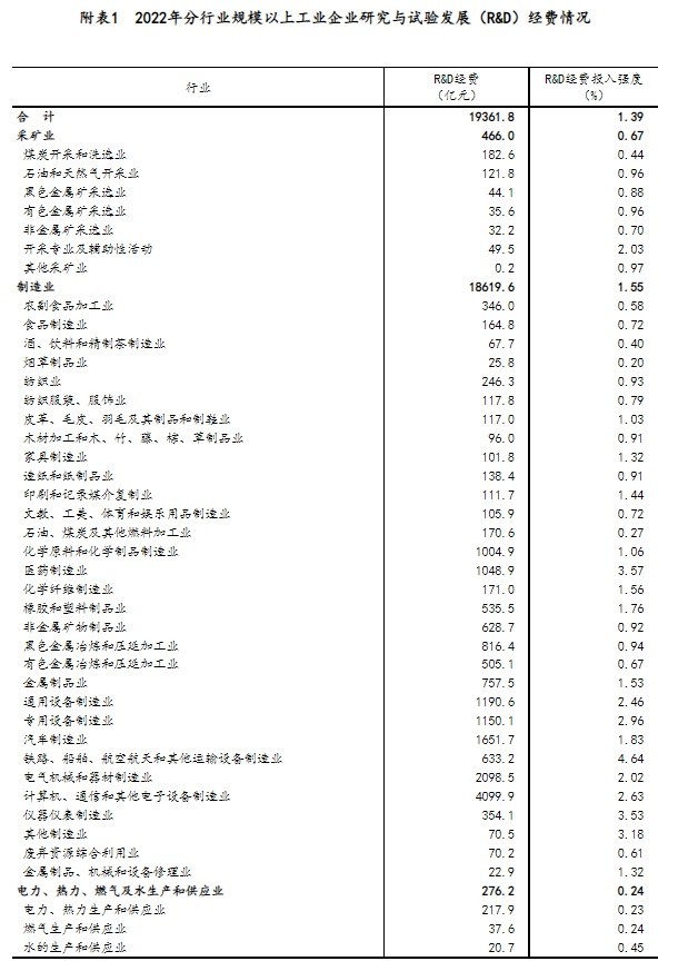 分產(chǎn)業(yè)部門看,高技術(shù)制造業(yè)研究與試驗(yàn)發(fā)展(R&D)經(jīng)費(fèi)6507.7億元,投入強(qiáng)度(與營業(yè)收入之比)為2.91%,比上年提高0.20個百分點(diǎn)。在規(guī)模以上工業(yè)企業(yè)中,研究與試驗(yàn)發(fā)展(R&D)經(jīng)費(fèi)投入超過千億元的行業(yè)大類有7個,比上年增加2個,這7個行業(yè)的經(jīng)費(fèi)占全部規(guī)模以上工業(yè)企業(yè)研究與試驗(yàn)發(fā)展(R&D)經(jīng)費(fèi)的比重為63.2%(詳見附表1)。