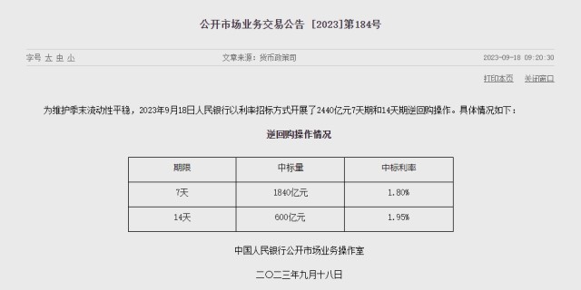 央視網(wǎng)消息:中國人民銀行發(fā)布公告,為維護季末流動性平穩(wěn),9月18日以利率招標方式開展2440億元7天期和14天期逆回購操作。