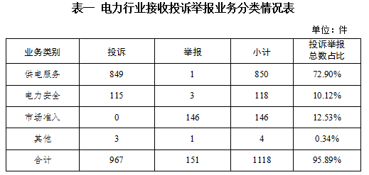 電力行業(yè)排在首位,數(shù)量為1118件、占投訴舉報(bào)總數(shù)的95.89%,主要集中在供電服務(wù)、市場(chǎng)準(zhǔn)入、電力安全等方面。
