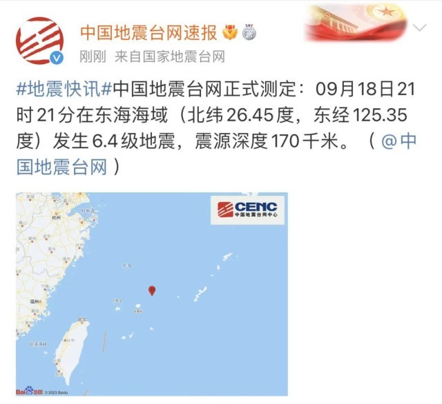 此前,經(jīng)中國地震臺網(wǎng)自動測定:09月18日21時21分在中國臺灣東北附近(北緯26.30度,東經(jīng)125.38度)發(fā)生6.7級左右地震(最終結(jié)果以正式速報為準(zhǔn))。