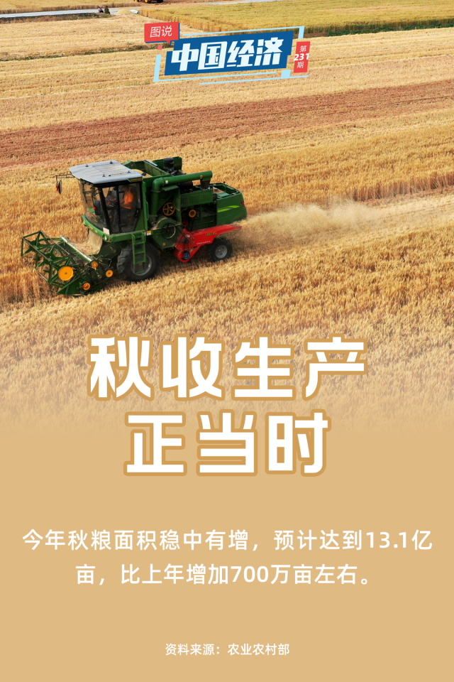 目前,我國早稻和夏糧均獲豐收,秋糧面積預(yù)計13.1億畝,比去年穩(wěn)中有增,豐收有基礎(chǔ)有希望。為保障今年秋收生產(chǎn),我國繼續(xù)從守護耕地、推進大中型灌區(qū)建設(shè)、保障農(nóng)民種糧有錢賺不吃虧等方面入手,保障糧食安全,端牢中國飯碗。