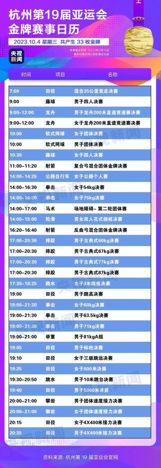 最后,小編還為你準備了一份杭州亞運會金牌賽事日歷,日歷里包含所有481枚金牌產(chǎn)生的時間?;瑒邮种福纯茨汴P(guān)注的比賽在哪天舉行。