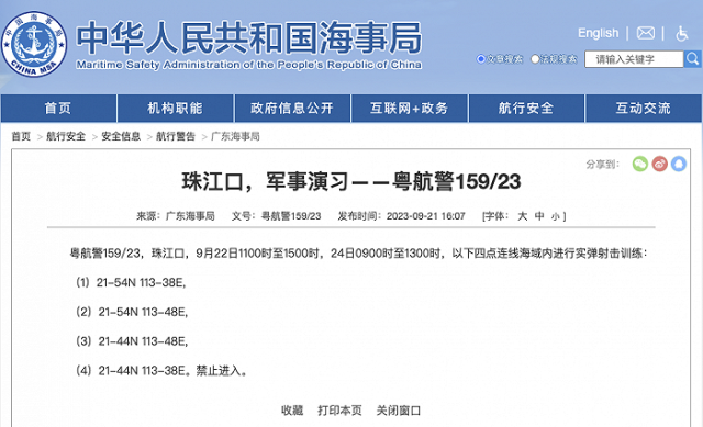 央視網(wǎng)消息:據(jù)中國海事局網(wǎng)站消息,廣東海事局發(fā)布航行警告,9月22日11時至15時,24日9時至13時,珠江口部分海域進行實彈射擊訓練,禁止進入。