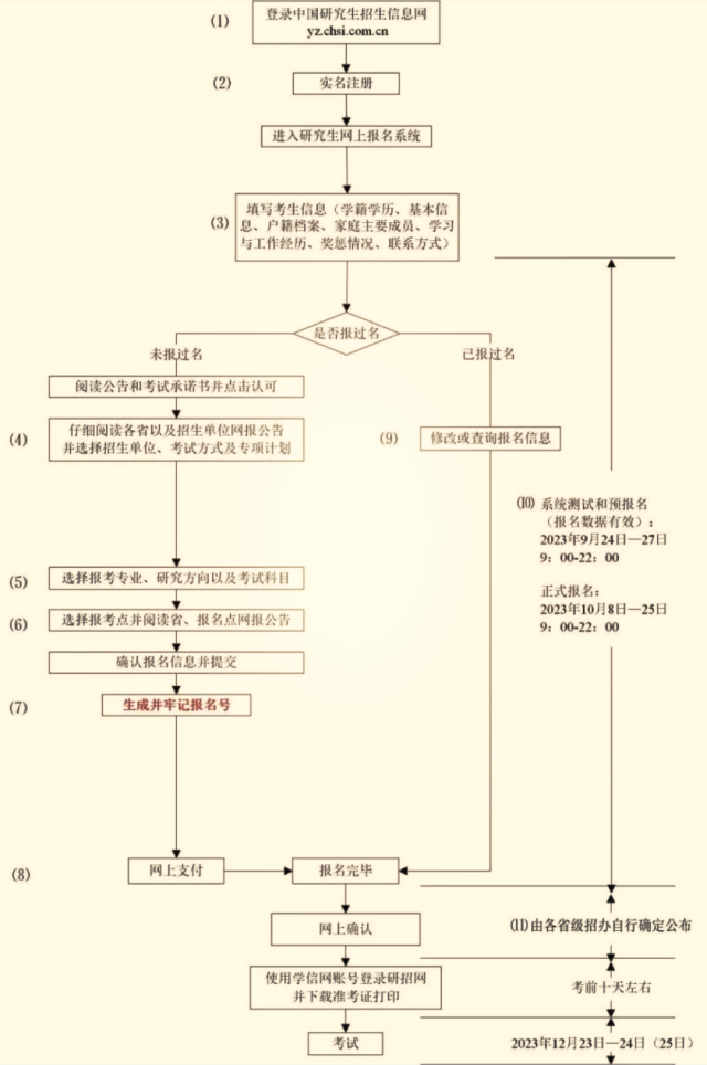 ?。?)考生應(yīng)在規(guī)定時(shí)間登錄“中國研究生招生信息網(wǎng)”(網(wǎng)址:https://yz.chsi.com.cn)瀏覽報(bào)考須知,并按省級(jí)教育招生考試機(jī)構(gòu)、報(bào)考點(diǎn)以及報(bào)考招生單位的網(wǎng)上公告要求報(bào)名;