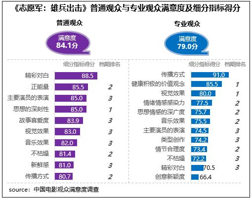 在不同觀眾評價上,《志愿軍:雄兵出擊》相對更受專業(yè)觀眾青睞,專業(yè)觀眾滿意度得分79.0分,居檔期第二位;在細(xì)分指標(biāo)中,健康積極的價值觀念、視覺效果兩項指標(biāo)得分居檔期首位,同時分別居2023年調(diào)查50部影片的第4位和第8位。影片普通觀眾滿意度得分84.1分,居檔期第三位,僅比《堅如磐石》和《93國際列車大劫案:莫斯科行動》分別低0.1分、0.02分,細(xì)分指標(biāo)中思想深刻性得分居檔期首位。