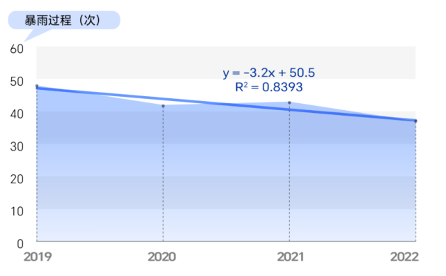 我們通過數(shù)據(jù)了解下我國近年來的暴雨發(fā)生頻次。2012年至2022年間,我國共發(fā)生暴雨天氣過程472次,年均發(fā)生次數(shù)約為42.9次;2016年暴雨發(fā)生次數(shù)最多,為51次;2014年最少,為36次(2023年未結(jié)束,暫不計(jì))。