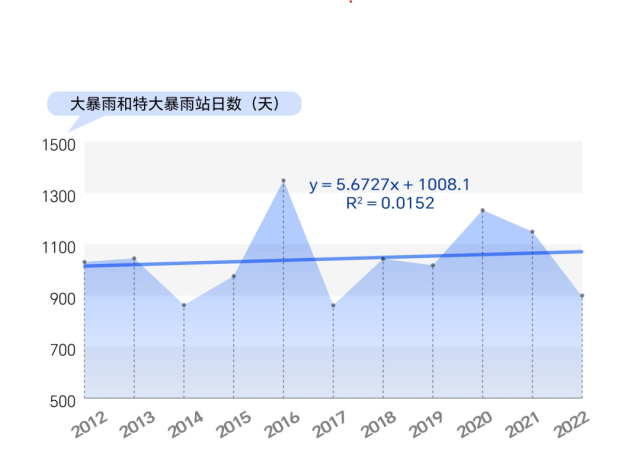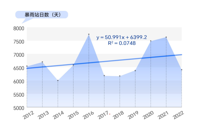 數(shù)據(jù)統(tǒng)計(jì)顯示,2012年至2022年,我國暴雨站日數(shù)有明顯的增加趨勢。這意味著,2012年到2022年,我國暴雨天氣過程的持續(xù)時(shí)間或影響范圍有增加(擴(kuò)大)的趨勢。