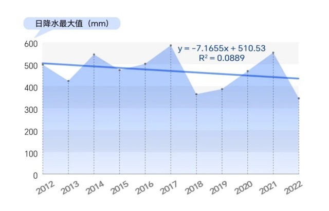 2012年至2022年國家級(jí)氣象觀測站記錄的最大單日降水量變化趨勢(單位:毫米)