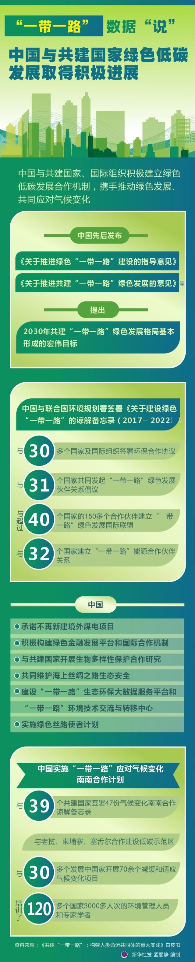 綠色低碳發(fā)展取得積極進展。中國與共建國家、國際組織積極建立綠色低碳發(fā)展合作機制,攜手推動綠色發(fā)展、共同應對氣候變化。中國先后發(fā)布《關于推進綠色“一帶一路”建設的指導意見》《關于推進共建“一帶一路”綠色發(fā)展的意見》等,提出2030年共建“一帶一路”綠色發(fā)展格局基本形成的宏偉目標。