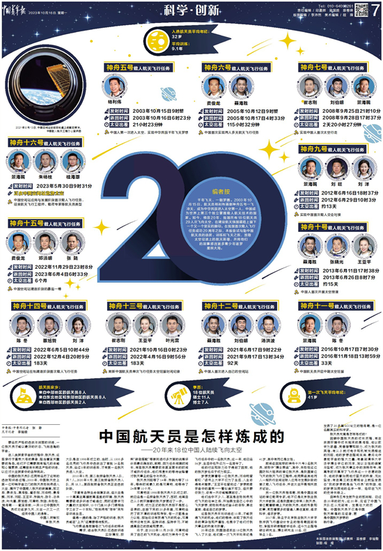 中國(guó)的航天員隊(duì)伍同樣經(jīng)歷了這樣的選拔和訓(xùn)練過(guò)程。2003年,中國(guó)航天史上第一位叩響宇宙之門(mén)的航天員楊利偉進(jìn)入太空,揭開(kāi)了中國(guó)載人航天的新篇章。那之后,費(fèi)俊龍、聶海勝、翟志剛、劉伯明、景海鵬、劉洋、劉旺、王亞平、張曉光、陳冬、湯洪波、葉光富、蔡旭哲、鄧清明、張陸、朱楊柱、桂海潮……截至目前,一共18位中國(guó)航天員成功逐夢(mèng)九天,太空一次又一次迎來(lái)中國(guó)人的身影。