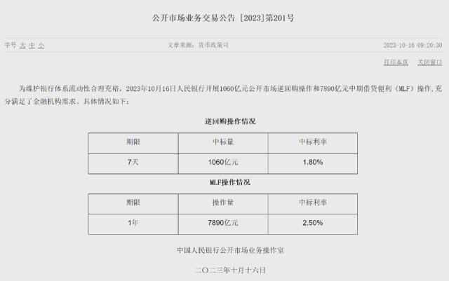 為維護(hù)銀行體系流動(dòng)性合理充裕,10月16日中國人民銀行開展1060億元公開市場逆回購操作和7890億元中期借貸便利(MLF)操作,充分滿足了金融機(jī)構(gòu)需求。