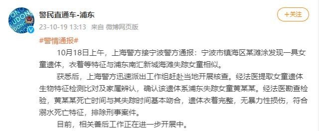 央視網(wǎng)消息:據(jù)@警民直通車(chē)-浦東 消息,10月18日上午,上海警方接寧波警方通報(bào):寧波市鎮(zhèn)海區(qū)某灘涂發(fā)現(xiàn)一具女童遺體,衣著等特征與浦東南匯新城海灘失蹤女童相似。