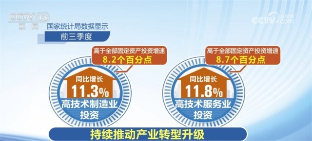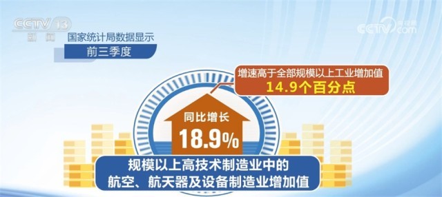 高技術(shù)產(chǎn)業(yè)投資動力強(qiáng)勁,新動能領(lǐng)域保持較快增長。國家統(tǒng)計局?jǐn)?shù)據(jù)顯示,前三季度,高技術(shù)制造業(yè)投資和高技術(shù)服務(wù)業(yè)投資分別同比增長11.3%和11.8%,分別高于全部固定資產(chǎn)投資增速8.2和8.7個百分點(diǎn),持續(xù)推動產(chǎn)業(yè)轉(zhuǎn)型升級。規(guī)模以上高技術(shù)制造業(yè)中的航空、航天器及設(shè)備制造業(yè)增加值同比增長18.9%,增速高于全部規(guī)模以上工業(yè)增加值14.9個百分點(diǎn)。