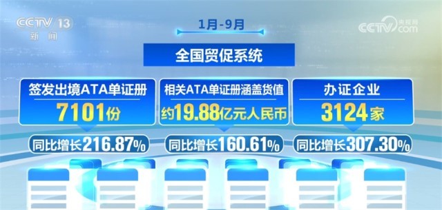 1月—9月,全國貿(mào)促系統(tǒng)共簽發(fā)出境ATA單證冊7101份,同比增長216.87%;相關(guān)ATA單證冊涵蓋貨值約19.88億元人民幣,同比增長160.61%;辦證企業(yè)3124家,同比增長307.30%。