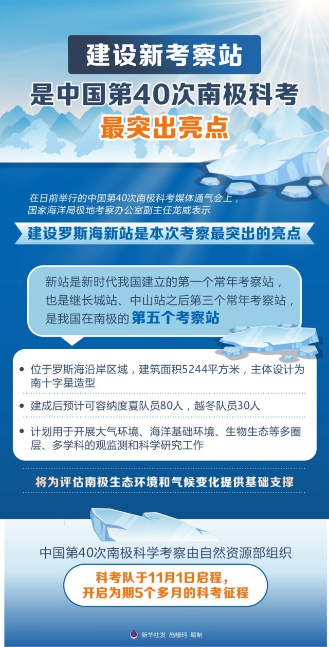 新華社上海11月1日電 “建設羅斯海新站是本次考察最突出的亮點?!痹谌涨芭e行的中國第40次南極科考媒體通氣會上,國家海洋局極地考察辦公室副主任龍威表示,新站是新時代我國建立的第一個常年考察站,也是繼長城站、中山站之后第三個常年考察站,是我國在南極的第五個考察站。