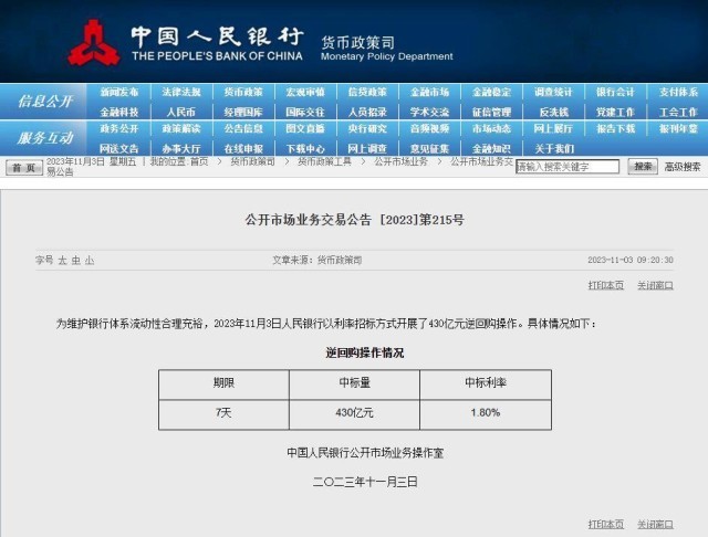 據(jù)央行官網(wǎng)消息,為維護銀行體系流動性合理充裕,2023年11月3日中國人民銀行以利率招標方式開展了430億元逆回購操作。具體情況如下: