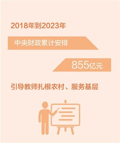 2018年到2023年中央財(cái)政累計(jì)安排855億元引導(dǎo)教師扎根農(nóng)村、服務(wù)基層