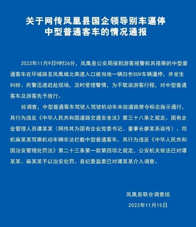 央視網(wǎng)消息:據(jù)鳳凰融媒微信公眾號(hào)消息,11月15日,鳳凰縣聯(lián)合調(diào)查組發(fā)布情況通報(bào),經(jīng)調(diào)查,中型普通客車駕駛?cè)笋{駛機(jī)動(dòng)車未按道路禁令標(biāo)志指示通行,其行為違反相關(guān)規(guī)定。國(guó)有企業(yè)管理人員譚某某 (網(wǎng)傳其為國(guó)有企業(yè)黨委書(shū)記、董事長(zhǎng)廖某系誤傳)、司機(jī)麻某某駕乘機(jī)動(dòng)車輛非法攔截中型普通客車,其行為違反相關(guān)規(guī)定,公安機(jī)關(guān)依法已對(duì)譚某某、麻某某予以治安處罰??h紀(jì)委監(jiān)委已對(duì)譚某某介入調(diào)查。