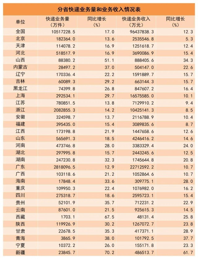 1-10月,郵政行業(yè)業(yè)務(wù)收入(不包括郵政儲蓄銀行直接營業(yè)收入)累計(jì)完成12351.5億元,同比增長11.5%。其中,快遞業(yè)務(wù)收入累計(jì)完成9643.8億元,同比增長12.3%。