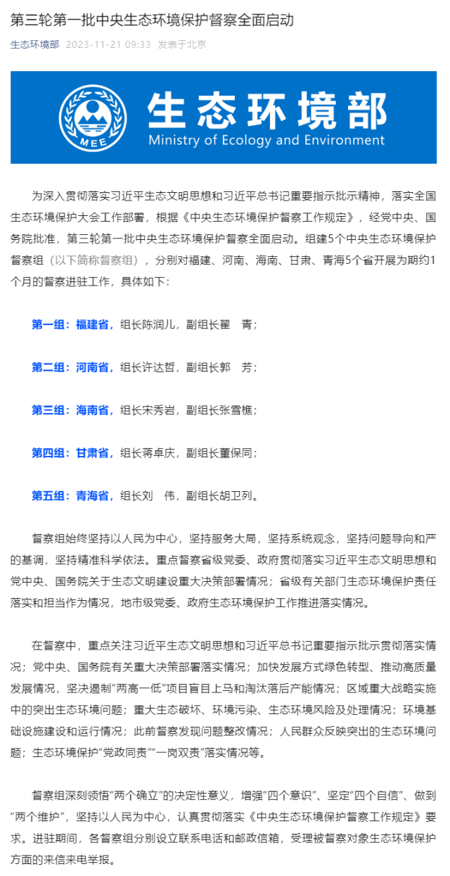 央視網(wǎng)消息:據(jù)生態(tài)環(huán)境部消息,為深入貫徹落實習近平生態(tài)文明思想和習近平總書記重要指示批示精神,落實全國生態(tài)環(huán)境保護大會工作部署,根據(jù)《中央生態(tài)環(huán)境保護督察工作規(guī)定》,經(jīng)黨中央、國務院批準,第三輪第一批中央生態(tài)環(huán)境保護督察全面啟動。組建5個中央生態(tài)環(huán)境保護督察組(以下簡稱督察組),分別對福建、河南、海南、甘肅、青海5個省開展為期約1個月的督察進駐工作,具體如下: