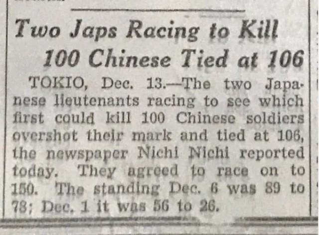 “根據(jù)《東京日日新聞》報道,兩名日本軍官比賽看誰能先殺死100名中國士兵,結(jié)果都殺了超過100人,雙方打平殺了106人,他們又同意重新比賽殺到150人為止,12月6日是89比78,12月1日是56比26?!边@是1937年12月14日發(fā)行的《芝加哥每日論壇》中,一篇有關(guān)兩名日本軍官進行“百人斬”殺人競賽的報道節(jié)選。