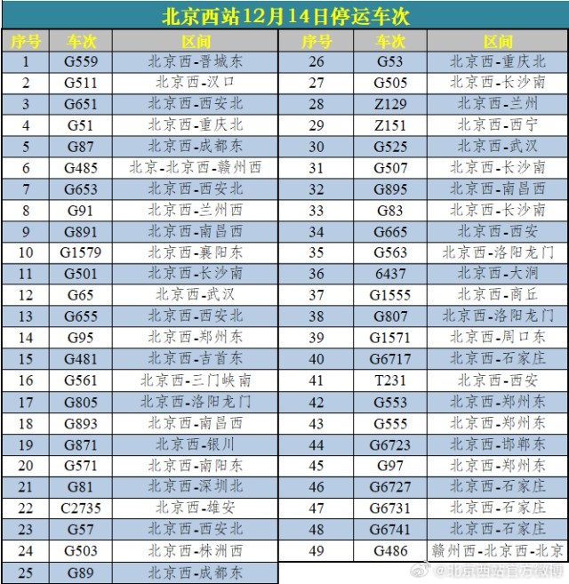 受降雪影響 北京西站、北京豐臺站12月14日60趟列車停運