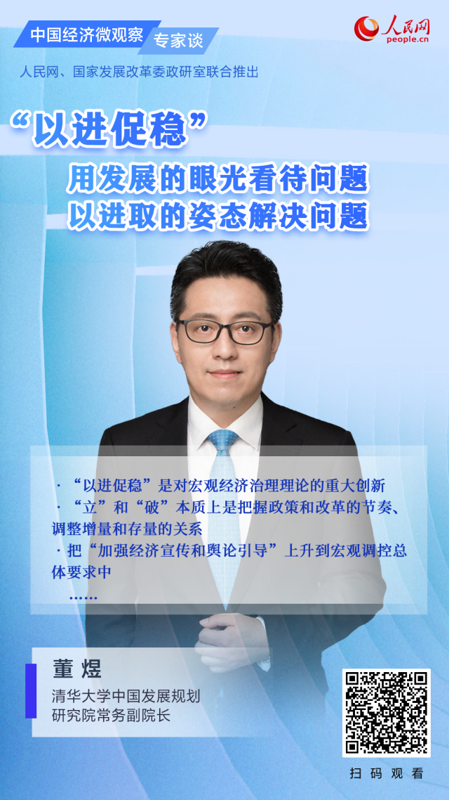 日前,清華大學中國發(fā)展規(guī)劃研究院常務副院長董煜做客《中國經濟微觀察·專家談》欄目時表示,“以進促穩(wěn)”是對宏觀經濟治理理論的重大創(chuàng)新,提出了進和穩(wěn)之間基于動態(tài)平衡的更高水平要求。他認為這是一種新的穩(wěn)定觀,即以發(fā)展眼光看待問題,并以積極進取的姿態(tài)解決面臨的安全和穩(wěn)定問題。實現“以進促穩(wěn)”的目標,要通過結構、質量、效益、改革的“進”來創(chuàng)造穩(wěn)定發(fā)展的環(huán)境。