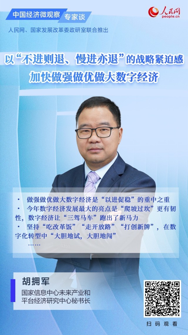 近日,國(guó)家信息中心未來(lái)產(chǎn)業(yè)和平臺(tái)經(jīng)濟(jì)研究中心秘書長(zhǎng)胡擁軍做客《中國(guó)經(jīng)濟(jì)微觀察·專家談》欄目時(shí)表示,“以進(jìn)促穩(wěn)”是中央經(jīng)濟(jì)工作會(huì)議釋放的最鮮明的積極信號(hào)之一,從經(jīng)濟(jì)回升向好的趨勢(shì)、潛力、基礎(chǔ)來(lái)看,做強(qiáng)做優(yōu)做大數(shù)字經(jīng)濟(jì)是“以進(jìn)促穩(wěn)”的重中之重。