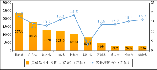 主要軟件大省收入占比持續(xù)提升。1—11月份,軟件業(yè)務(wù)收入居前5名的省份中,北京市,廣東省,江蘇省,山東省,上海市軟件收入分別為23756億元、18190億元、12920億元、12315億元和10184億元,分別增長17.8%、14.2%、13.2%、16.2%和18.5%,五?。ㄊ校┖嫌嬡浖I(yè)務(wù)收入77365億元,占全國比重為70%,占比較去年同期提高1.2個百分點。