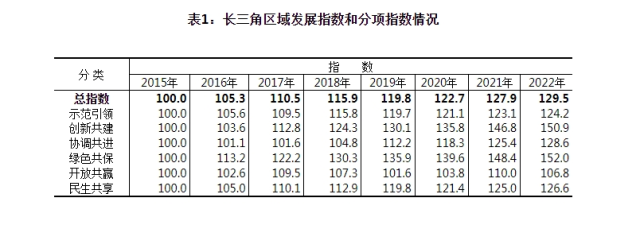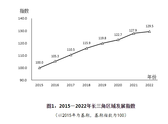 從測算結果看,以2015年為基期,2022年長三角區(qū)域發(fā)展指數為129.5,比上年提高1.6,年均提高4.2。