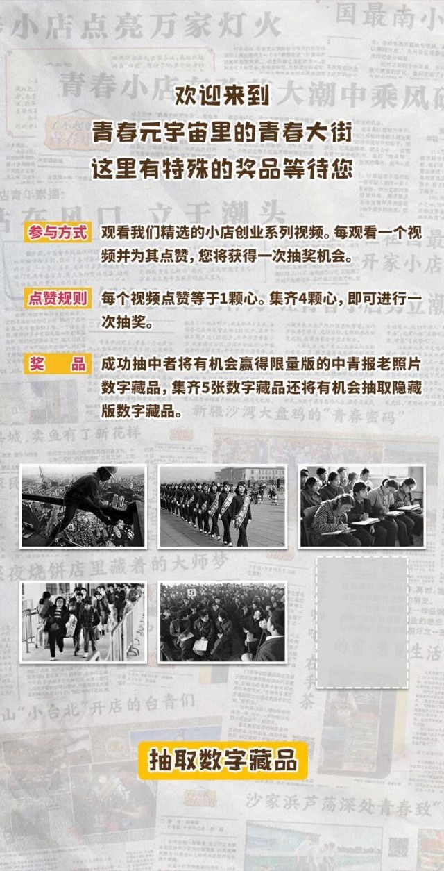 奔跑在青春大街上的青小豹邀請讀者一起玩尋找小店的游戲,大家可以邊體驗邊觀看一個個小店和店主的故事,參加愛心點贊,還可以參與抽獎。獎品是用區(qū)塊鏈技術創(chuàng)制的數字藏品——改革開放45年以來中國青年報拍攝的精彩照片。