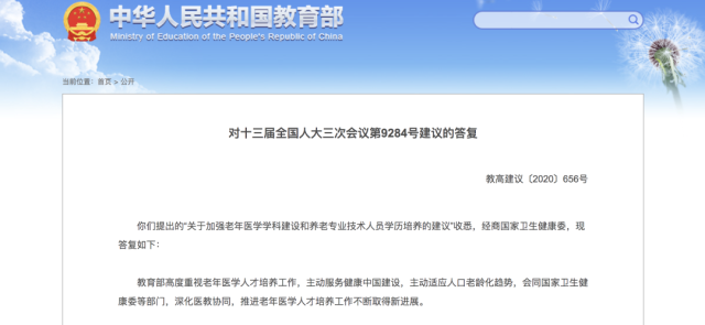 早在2021年,教育部官網(wǎng)曾公布《對(duì)十三屆全國(guó)人大三次會(huì)議第9284號(hào)建議的答復(fù)》,下一步,教育部將進(jìn)一步加強(qiáng)面向全體醫(yī)學(xué)類專業(yè)學(xué)生開展老年醫(yī)學(xué)教育,同時(shí),協(xié)同國(guó)家衛(wèi)生健康委,鼓勵(lì)高校加強(qiáng)老年醫(yī)學(xué)學(xué)科建設(shè)、推進(jìn)老年醫(yī)學(xué)??漆t(yī)師規(guī)范化培訓(xùn)。