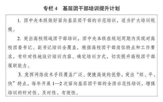 ?。ǘ┩怀觥瓣P(guān)鍵少數(shù)”政治訓(xùn)練。堅(jiān)持把政治訓(xùn)練貫穿團(tuán)干部成長(zhǎng)全周期,使團(tuán)干部的政治素養(yǎng)、政治能力與擔(dān)負(fù)的領(lǐng)導(dǎo)職責(zé)相匹配。強(qiáng)化“一把手”政治培訓(xùn),有計(jì)劃地選調(diào)團(tuán)的各級(jí)領(lǐng)導(dǎo)機(jī)關(guān)主要負(fù)責(zé)同志到團(tuán)干部教育培訓(xùn)機(jī)構(gòu)參加專題培訓(xùn)。強(qiáng)化對(duì)團(tuán)縣(市、區(qū)、旗)委書記這一群體的培訓(xùn),實(shí)施團(tuán)縣(市、區(qū)、旗)委書記能力提升計(jì)劃(專欄2)。突出對(duì)團(tuán)的領(lǐng)導(dǎo)機(jī)關(guān)干部的政治訓(xùn)練,各級(jí)團(tuán)的領(lǐng)導(dǎo)機(jī)關(guān)加強(qiáng)對(duì)機(jī)關(guān)干部的常態(tài)化政治能力培訓(xùn)。加強(qiáng)對(duì)青年人才的政治引領(lǐng),團(tuán)中央組織部會(huì)同有關(guān)單位每年組織一定數(shù)量青年人才開展國(guó)情研修。積極推動(dòng)將地方團(tuán)的領(lǐng)導(dǎo)機(jī)關(guān)班子成員培訓(xùn)納入地方黨委組織開展的干部政治理論培訓(xùn)范疇。