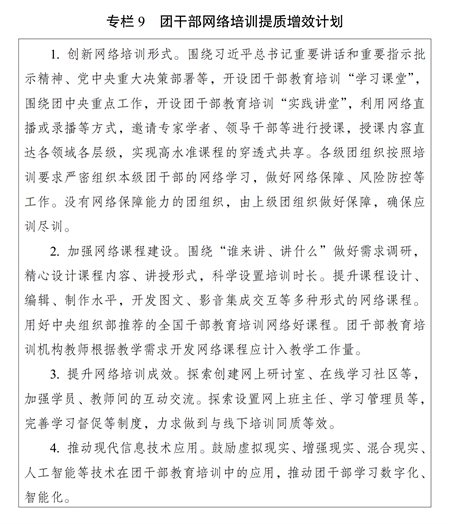 ?。ǘ┘訌?qiáng)網(wǎng)絡(luò)培訓(xùn)課程建設(shè)。鼓勵(lì)團(tuán)干部教育培訓(xùn)機(jī)構(gòu)開發(fā)精品網(wǎng)絡(luò)課程。注重把握網(wǎng)絡(luò)教學(xué)特點(diǎn)和規(guī)律,改進(jìn)授課方式,提高制作水平,豐富呈現(xiàn)形式,提升課程質(zhì)量。嚴(yán)把網(wǎng)絡(luò)課程政治關(guān)、質(zhì)量關(guān),規(guī)范講授、制作、審核、發(fā)布和更新、退出流程。充分發(fā)揮網(wǎng)絡(luò)培訓(xùn)優(yōu)勢(shì),推動(dòng)優(yōu)質(zhì)資源下基層。用好網(wǎng)絡(luò)直播培訓(xùn)形式,增強(qiáng)現(xiàn)場(chǎng)體驗(yàn)感。實(shí)施團(tuán)干部網(wǎng)絡(luò)培訓(xùn)提質(zhì)增效計(jì)劃(專欄9)。