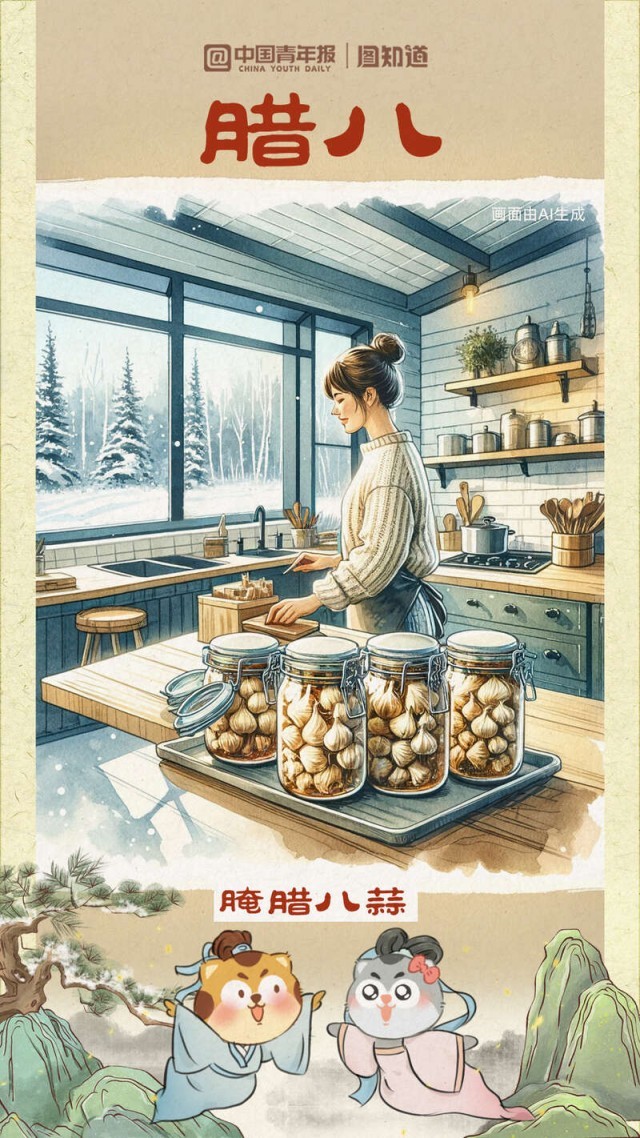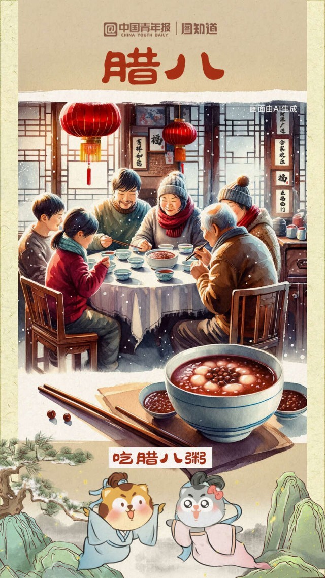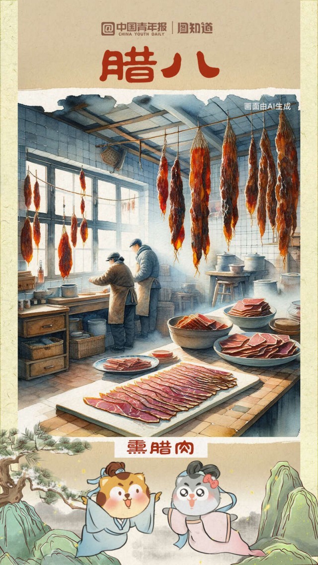 又是一年臘八時(shí),道一聲萬事“粥”全?!坝煤?、松子、乳蕈、柿、栗之類為粥,謂之‘臘八粥’?!边@是南宋周密筆下的臘八粥。你的“臘八”餐桌想擺上哪些地方的美食?①湖南湖北的熏臘肉②北方地區(qū)的臘八蒜、臘八醋③陜西關(guān)中地區(qū)臘八面……過了臘八就是年,幾幅臘八美食與你一起迎接小年。