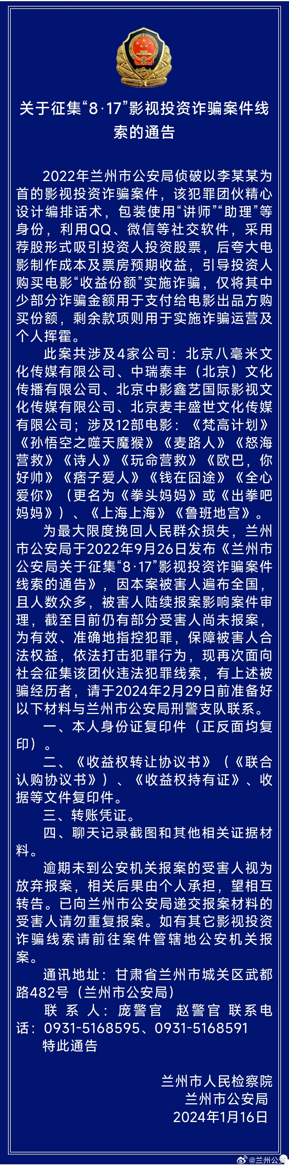 為最大限度挽回人民群眾損失,蘭州市公安局早在2022年9月26日發(fā)布《蘭州市公安局關(guān)于征集“8·17”影視投資詐騙案件線索的通告》,但因本案被害人遍布全國,且人數(shù)眾多,受害人陸續(xù)報案影響案件審理,截至目前仍有部分受害人尚未報案。