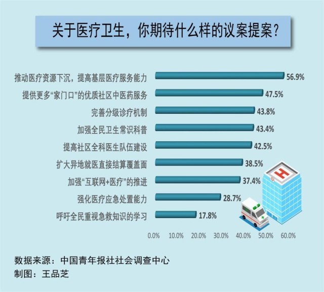每年全國兩會,醫(yī)療衛(wèi)生都是代表委員們熱議的話題。在全國兩會召開前夕,中國青年報社社會調查中心聯(lián)合問卷網(wenjuan.com),進行了全國兩會青年期待調查,共有2002人參與。調查顯示,在兩會關于醫(yī)療衛(wèi)生領域的議題中,56.9%的受訪者最期待推動醫(yī)療資源下沉,提高基層醫(yī)療服務能力,47.5%的受訪者期待提供更多“家門口”的優(yōu)質社區(qū)中醫(yī)藥服務。