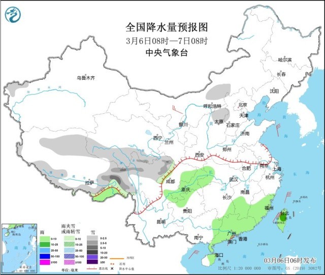 3月6日08時(shí)至7日08時(shí),西藏東部和南部、青海南部、川西高原北部、山西北部等地部分地區(qū)有小雪或雨夾雪,其中,西藏東部、川西高原北部等地部分地區(qū)有中到大雪。江南東部和南部、西南地區(qū)東部、華南中東部、臺灣島等地部分地區(qū)有小雨,其中,臺灣島北部等地部分地區(qū)有中雨。內(nèi)蒙古西北部部分地區(qū)有4~5級風(fēng)(見圖1)。