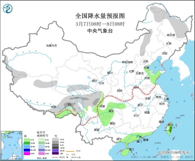 圖1 全國降水量預(yù)報(bào)圖(3月6日08時(shí)-7日08時(shí))