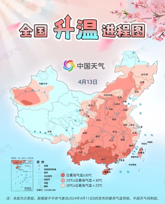 眼下,全國大部處于冷空氣影響間歇期,升溫是主旋律。預計今起三天(4月11日至13日),我國從北到南都將開啟回暖進程,最高氣溫25℃以上的區(qū)域幾乎覆蓋整個中東部,波及20余省份,東北、西北地區(qū)氣溫將大面積創(chuàng)今年以來新高,北方不少地方還會體驗到常年5月中旬才有的超前暖熱。中國天氣網(wǎng)推出全國升溫進程圖,看看哪些地方將沖擊30℃。