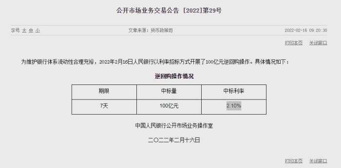 中新財(cái)經(jīng)2月16日電 16日,據(jù)中國(guó)人民銀行官網(wǎng)消息,為維護(hù)銀行體系流動(dòng)性合理充裕,2022年2月16日人民銀行以利率招標(biāo)方式開展了100億元逆回購(gòu)操作,中標(biāo)利率2.10%。(完)