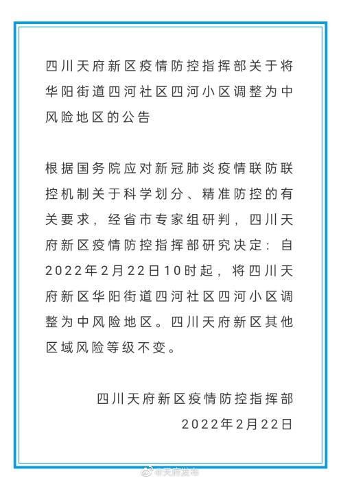 中新網(wǎng)2月22日電 據(jù)“天府發(fā)布”微博消息,四川天府新區(qū)疫情防控指揮部發(fā)布關(guān)于將華陽(yáng)街道四河社區(qū)四河小區(qū)調(diào)整為中風(fēng)險(xiǎn)地區(qū)的公告:
