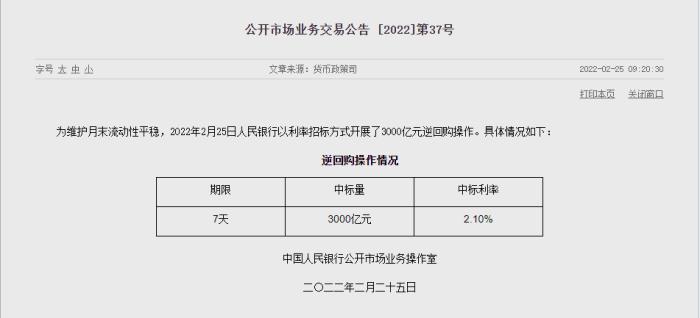中新財經(jīng)2月25日電 中國人民銀行官網(wǎng)25日消息,為維護月末流動性平穩(wěn),2022年2月25日人民銀行以利率招標方式開展了3000億元逆回購操作。(完)