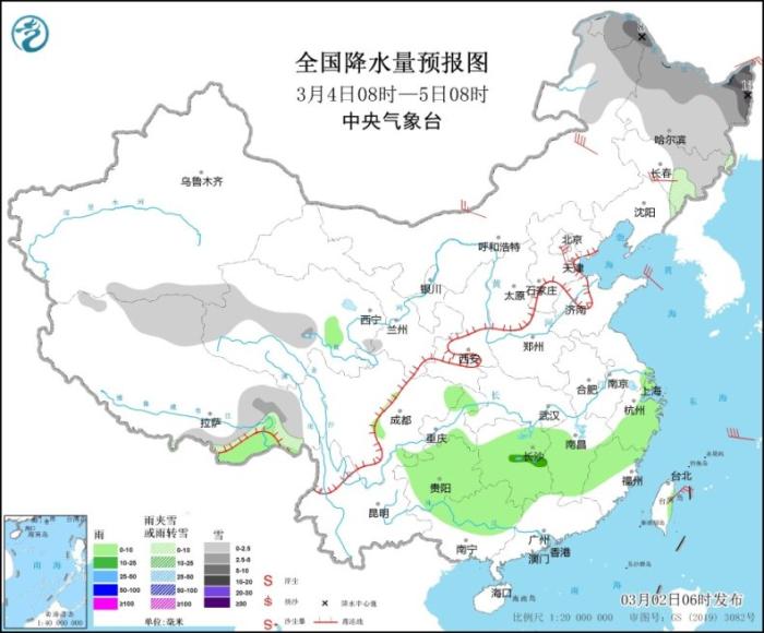 全國降水量預(yù)報圖(3月4日08時-5日08時)