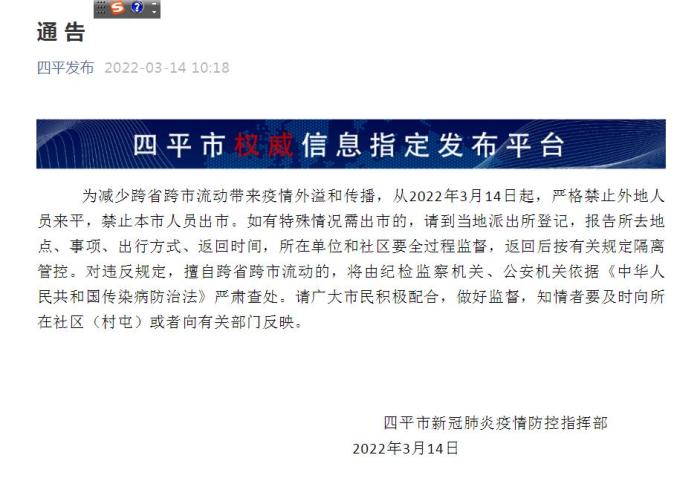 中新網3月14日電 據“四平發(fā)布”微信公眾號消息,14日,吉林省四平市新冠肺炎疫情防控指揮部發(fā)布通告,為減少跨省跨市流動帶來疫情外溢和傳播,從2022年3月14日起,嚴格禁止外地人員來平,禁止本市人員出市。如有特殊情況需出市的,請到當地派出所登記,報告所去地點、事項、出行方式、返回時間,所在單位和社區(qū)要全過程監(jiān)督,返回后按有關規(guī)定隔離管控。對違反規(guī)定,擅自跨省跨市流動的,將由紀檢監(jiān)察機關、公安機關依據《中華人民共和國傳染病防治法》嚴肅查處。請廣大市民積極配合,做好監(jiān)督,知情者要及時向所在社區(qū)(村屯)或者向有關部門反映。